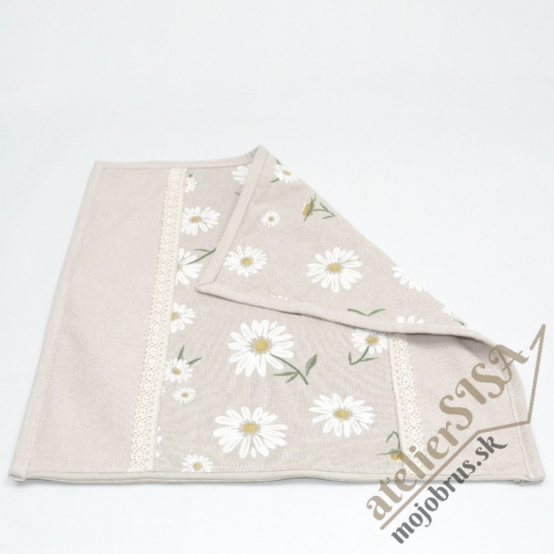 Obojstranná obliečka na dekoračný vankúš je ušitá zo zmesovej dekoračnej látky vyššej gramáže. Vzor jarných margarétiek na režnej je kombinovaný jednofarebnou látkou a zdobený bavlnenou paličkovanou čipkou. Môže vytvoriť krásnu Veľkonočnú atmosféru. Z troch strán je lemovaná a v spodnej hrane sa zapína na zips. Vďaka kvalitnému materiálu si udržujú skvelý vzhľad aj po opakovaných praniach.