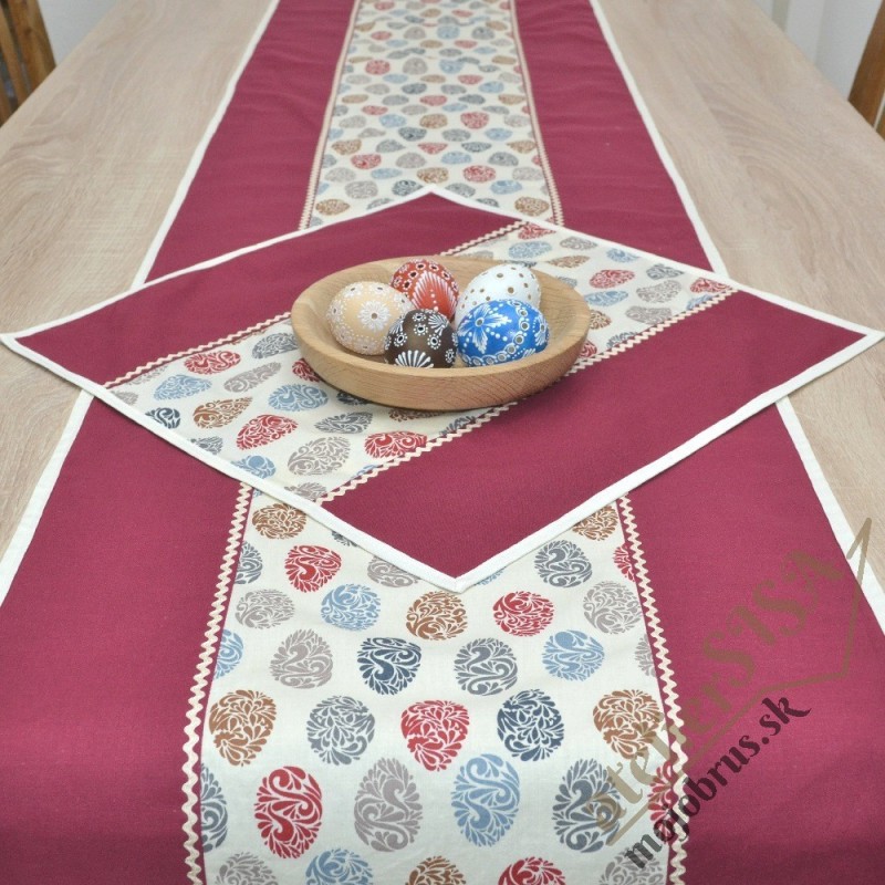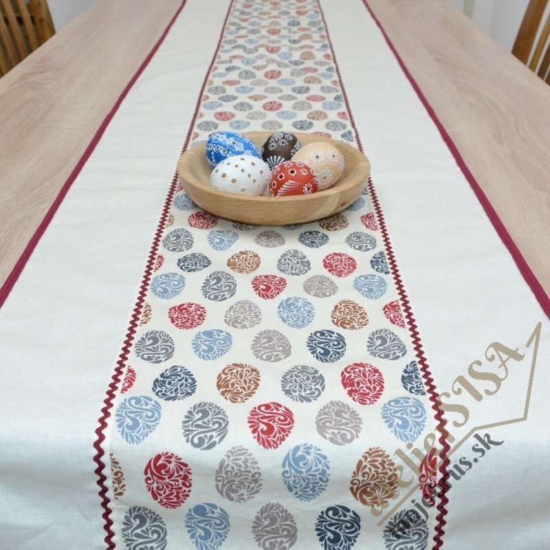 Veľkonočný obrus behúň je ušitý zo 100% dekoračnej bavlny.Vzor tvoria ornamenty v tvare vajíčok na smotanovom podklade v kombinácii s jednofarebnou bordovou alebo smotanovou látkou. Obrus je po celej dĺžke zdobený hadovkou vo farebných prechodoch v opačných farbách. Veľkonočná výzdoba u vás doma tak môže mať mnoho podôb a táto kolekcia k nej môže patriť. Uplatní sa v tradičných kuchyniach alebo na chatách a chalupách